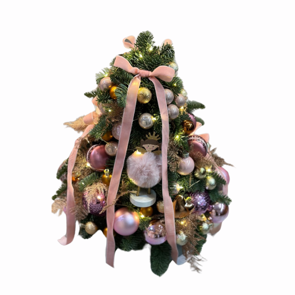 Mini Brad de Crăciun Decorat cu Fundițe Roz și Globuri Aurii și Roz, 50 cm