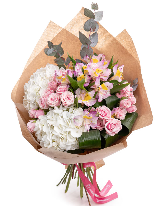Încântător și sofisticat, buchetul „Soft Elegance” aduce un rafinament subtil prin combinația armonioasă dintre hortensia albă și trandafirii mici roz. Fiecare element floral este atent selectat pentru a crea un aranjament ce simbolizează puritatea, afecțiunea și frumusețea eternă.