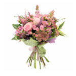 Buchet de oferit compus din 5 hortensii, 10 trandafiri, 10 liasianthus, eucalipt si funda saten